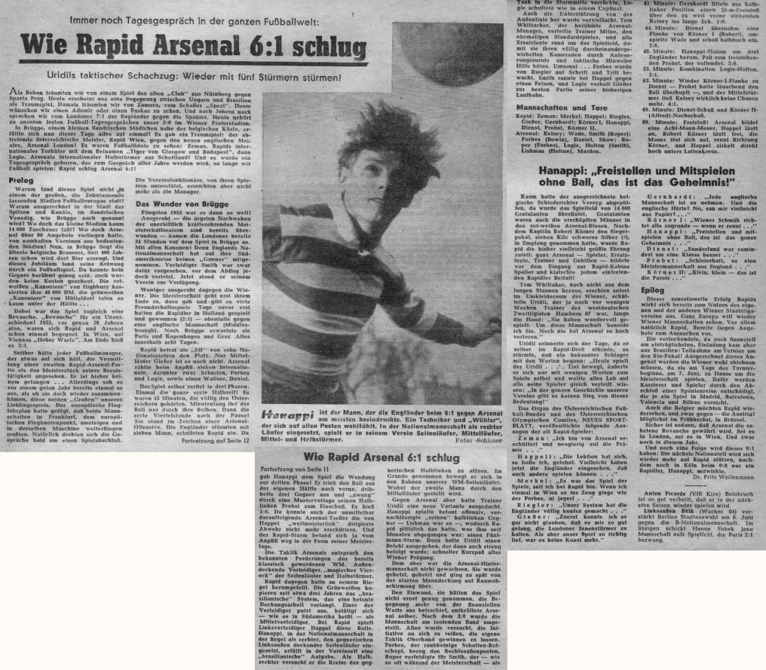 Im Jahr darauf reichte es für die erfolgsverwöhnten Grün-Weißen zwar nur zu Platz Drei. International warteten aber Sternstunden: So feiern die Rapidler am 24. Mai 1953 in Brügge mit einem 6:1 (2:0)-Sieg gegen den frischgebackenen englischen Meister Arsenal einen bedeutenden internationalen Erfolg. Rapid-Trainer Josef „Pepi“ Uridil, der im Frühjahr den langjährigen Betreuer Hans Pesser nach einer erfolglosen Südamerika-Tournee abgelöst hatte, schickt sein Team mit den Worten „Die sind elfe, wir sind elfe. Also spielt’s was könnt’s und wenn’s gewinnt’s gibt’s nachher a Sekterl“ ins Spiel. Bereits drei Tage zuvor hatten die Hütteldorfer vor 65.000 Zuschauern in Amsterdam mit dem FC Middlesbrough einen weiteren englischen Erstligisten mit 2:1 besiegt.