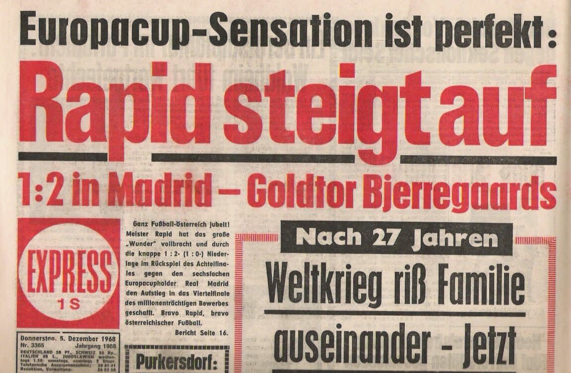 Einen der größten Momente auf internationaler Ebene erlebte unser Verein im Herbst 1968. Im Europacup-Achtelfinale gegen den sechsfachen Europacupsieger Real Madrid sorgte ein Tor von Günter Kaltenbrunner in Wien für einen 1:0-Heimsieg. Beim Rückspiel im Bernabeu-Stadion lag Rapid vor 80.000 Zuschauern zur Pause mit 0:1 zurück, aber in der 50. Minute erzielte Bjerregaard den spektakulären Ausgleichstreffer. Die Spaniern stellten zwar kurz vor Schluss auf 2:1, aber aufgrund des Auswärtstors stand Rapid im Viertelfinale. Dort scheiterten wir an Titelverteidiger Manchester United mit 0:3 und 0:0, konnten aber dennoch auf eine der legendärsten Europacup-Saisonen in unserer Geschichte zurückblicken.
