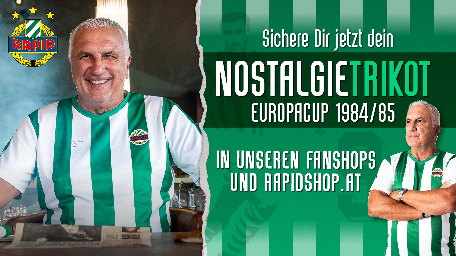 In Erinnerung an diese besondere Europacup-Saison ist ab sofort ein einzigartiges Nostalgietrikot mit der Rückennummer 9, in Anlehnung an das im EC-Finale getragene Trikot des "Goleadors" in unseren Fanshops und online unter rapidshop.at erhältlich.
