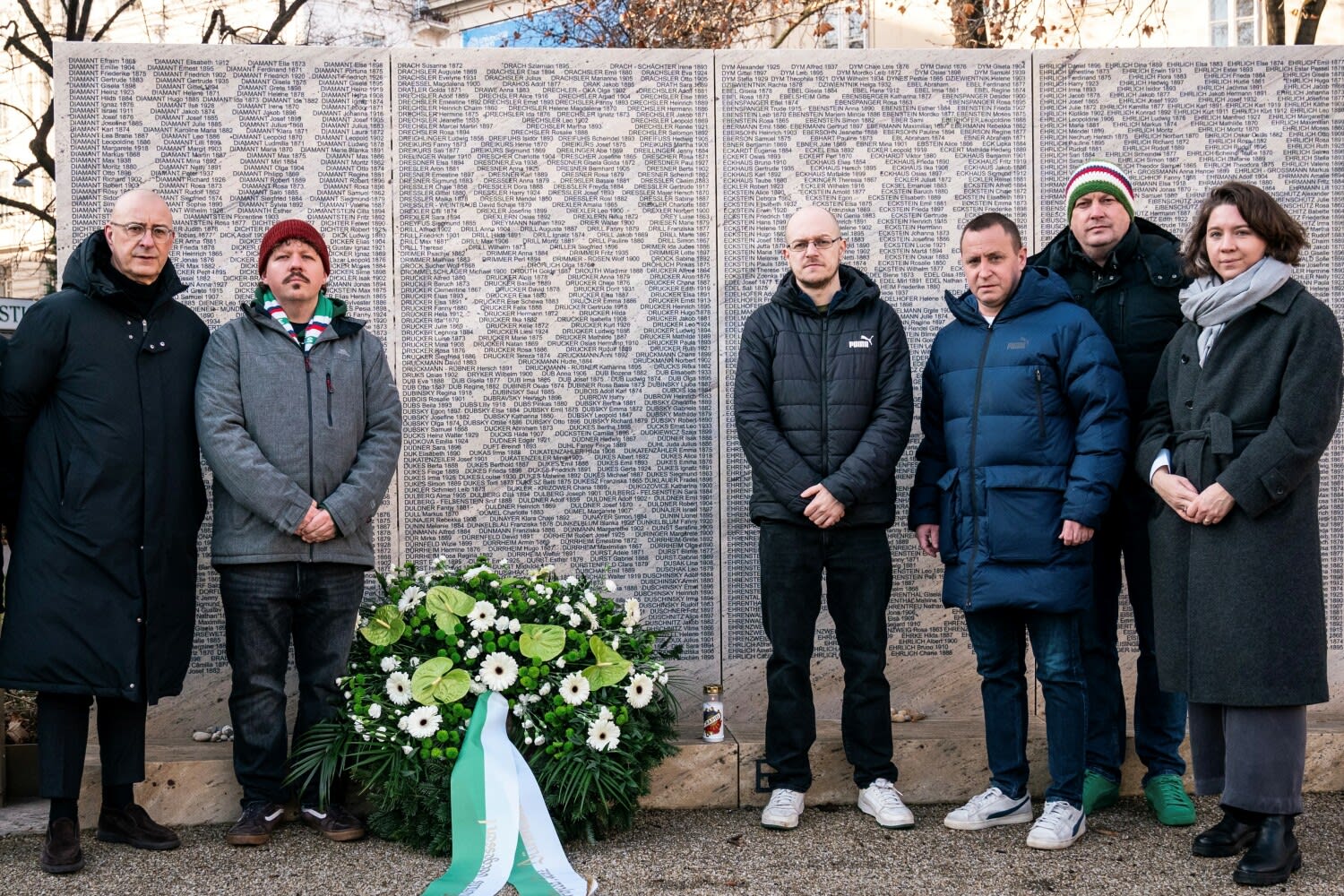 Auch in diesem Jahr wurden von einigen Vertreter:innen des SK Rapid Kränze an der Shoah-Namensmauer-Gedenkstätte niedergelegt! © SK Rapid|Widner
