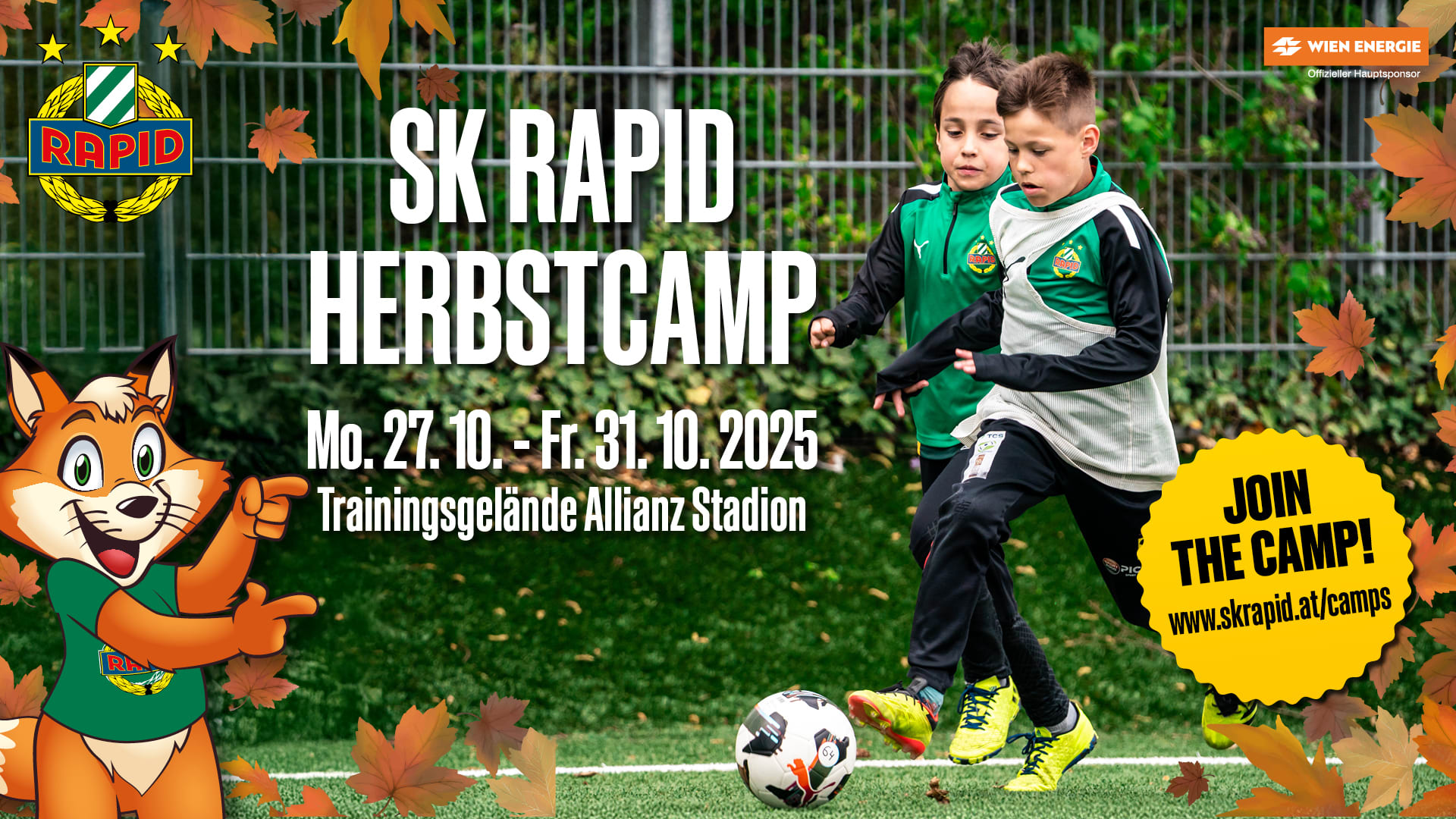 Mit Ende der erfolgreichen Fußball-Camp-Saison im Sommer 2025, bei der wieder rund 600 fußballbegeisterte Kids mit dabei waren, dürfen wir euch den bereits fixierten Termin für das diesjährige SK Rapid Herbstcamp präsentieren. Wir laden alle Burschen und Mädchen im Alter von 7 bis 14 Jahren dazu ein, in den Herbstferien (27.10. - 31.10.2025) bei unserem Fußball-Camp in Wien-Hütteldorf mit dabei zu sein.