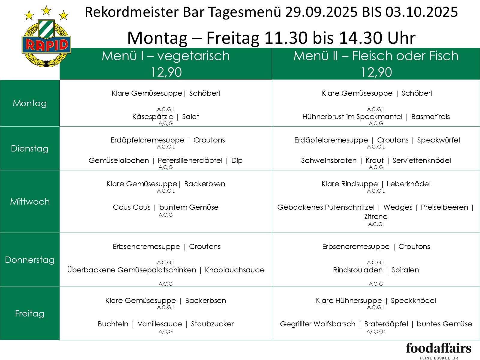 Menüplan Rekordmeister Bar vom 29. September bis 03. Oktober 2025