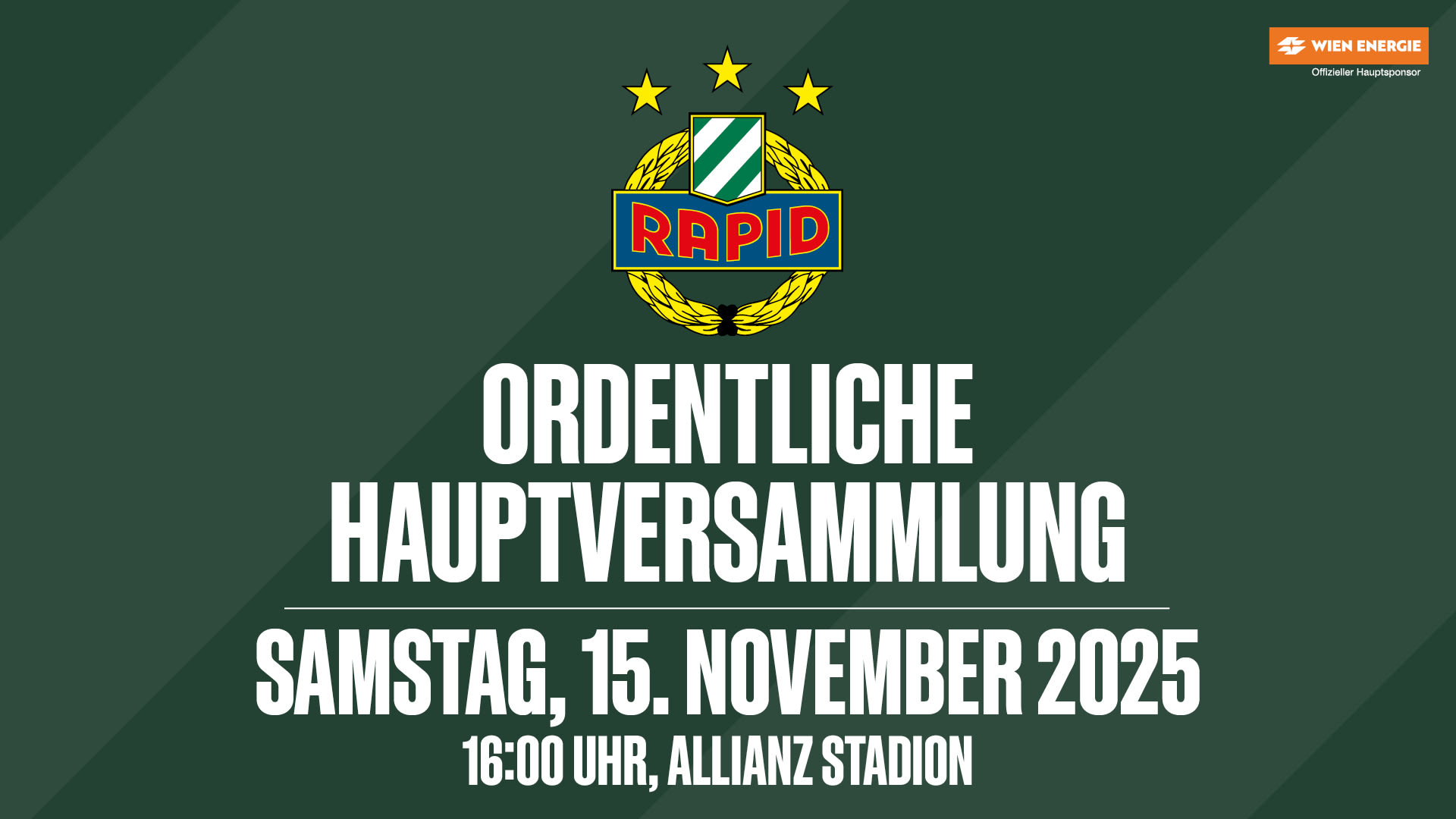 Am Samstag, 15. November 2025 findet ab 16:00 Uhr die ordentliche Hauptversammlung des SK Rapid statt, und zwar wie gewohnt in der Ebene 1 (Business Club) des Allianz Stadions (Gerhard-Hanappi-Platz 1, 1140 Wien).