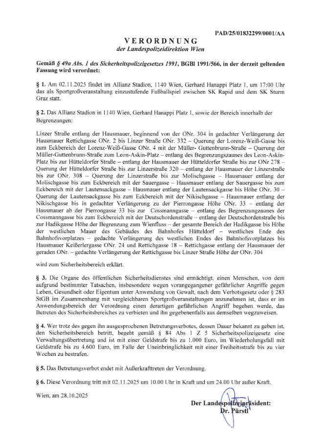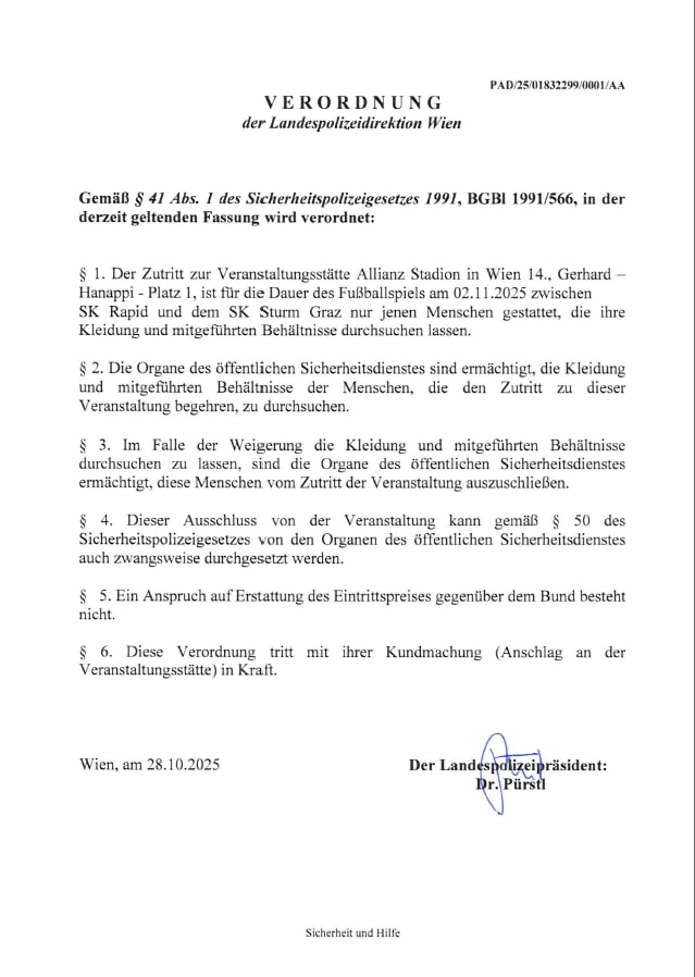SK Rapid – SK Sturm: Verordnung LPD Wien