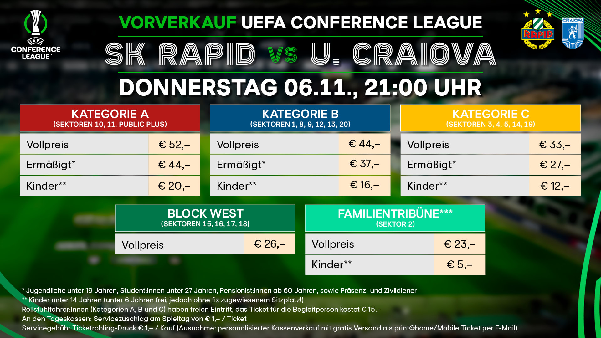 Die Tickets sind wie gewohnt online unter rapidshop.at oder im Fancorner in Hütteldorf (MO-SA 11-18 Uhr) erhältlich!