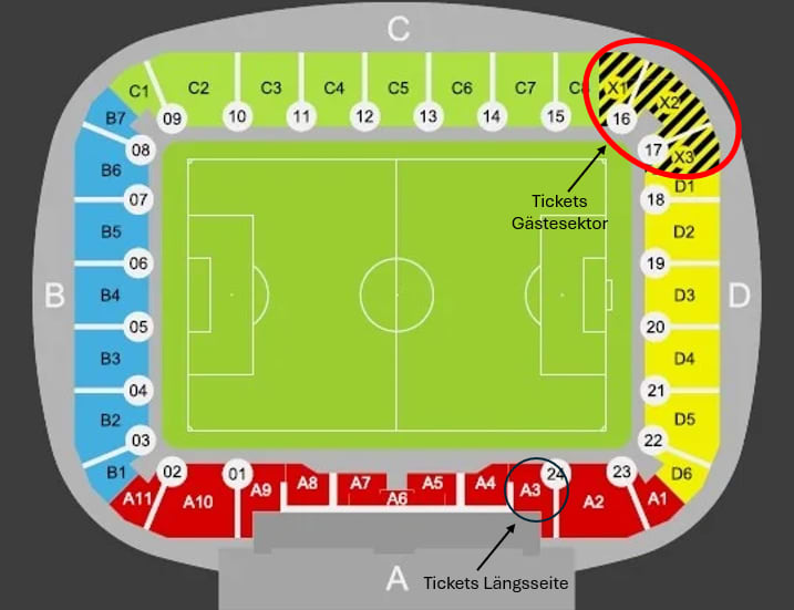 Die Tickets für den Gästesektor befinden sich in den Sektoren X1, X2 und X3, jene auf der Längsseite im Sektor A3 (siehe Stadionplan).