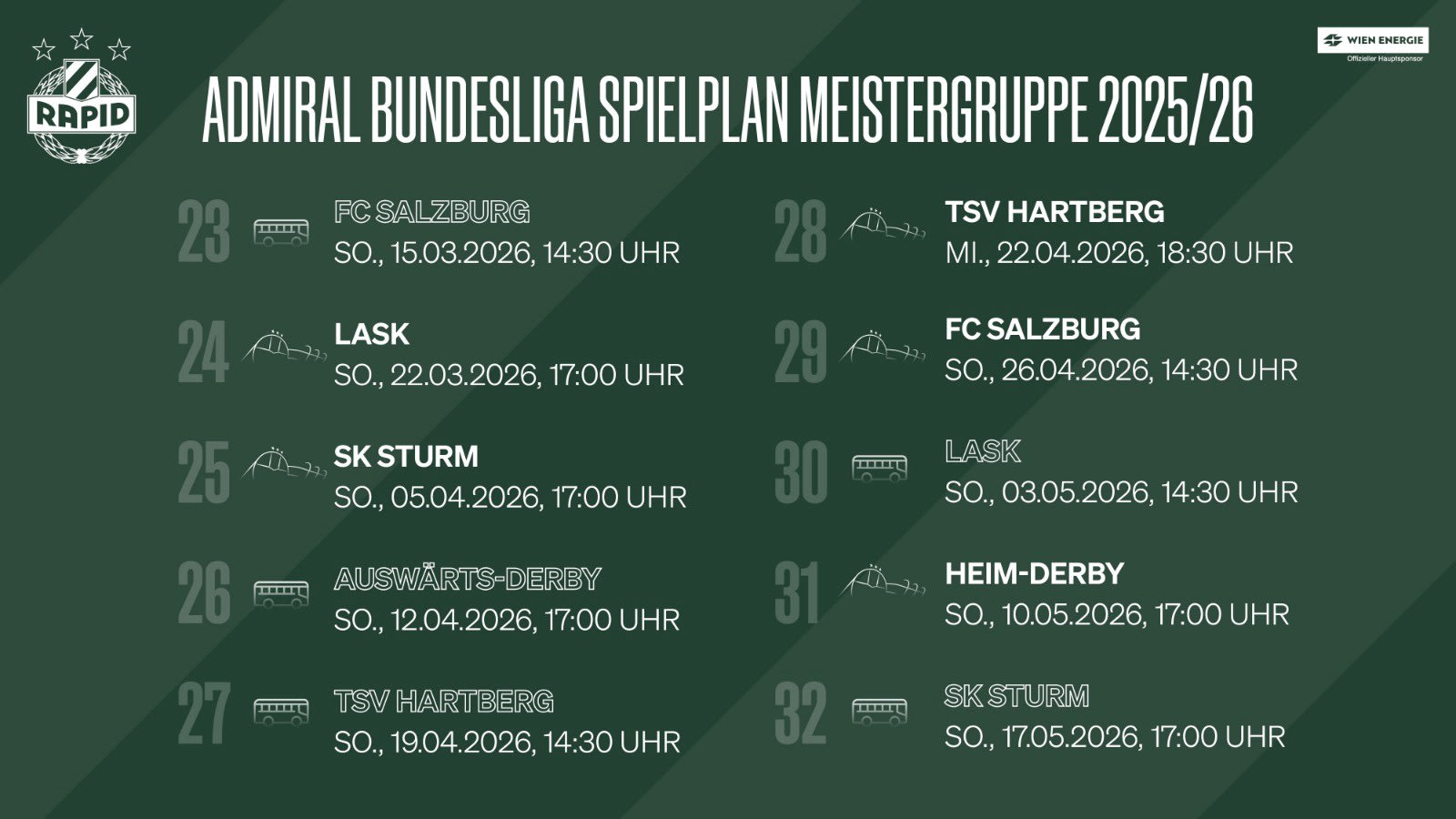 Nach dem 1:0-Heimsieg gegen den FC Salzburg steht unsere Mannschaft nun in der Meistergruppe der ADMIRAL Bundesliga Saison 2025/26. Zum Auftakt in die entscheidende Saisonphase kommt es zum direkten Wiedersehen mit den Mozartstädtern. Am Sonntag, 15. März sind wir um 14:30 Uhr in Salzburg zu Gast. Das erste Heimspiel folgt eine Woche später um 17:00 Uhr gegen den LASK.
