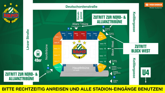 Zudem fahren die Straßenbahnlinien 49 und 52 direkt zum Allianz Stadion und halten auf der Linzer Straße (hinter der Nordtribüne) an der Station "Deutschordenstraße"!